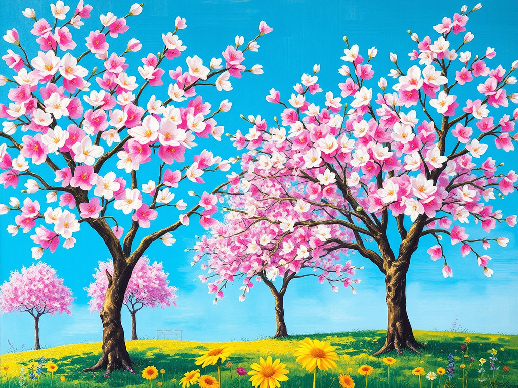 نقاشی از درختانی که در فصل بهار شکوفه دادهاند.