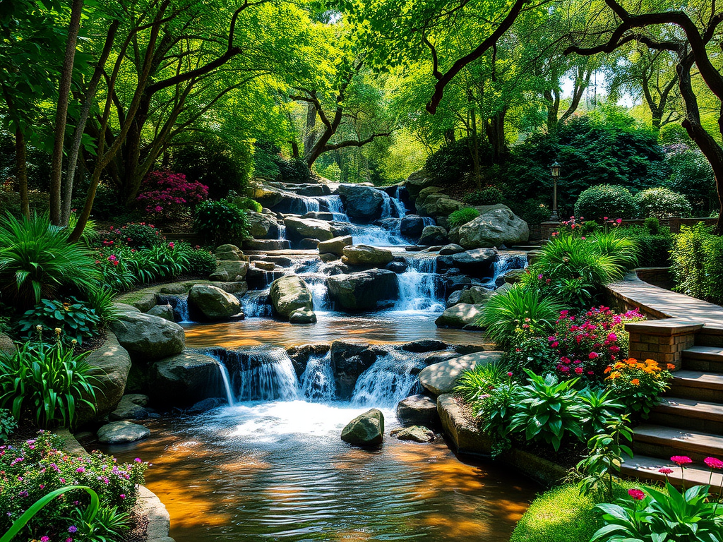 تصویری از آبنمای طبیعی در وسط یک باغ یا پارک.