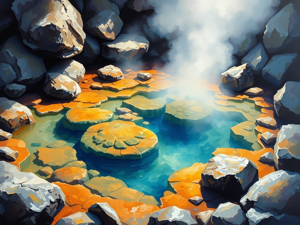 تصویری از چشمه آب گرم با بخار و سنگهای اطراف.