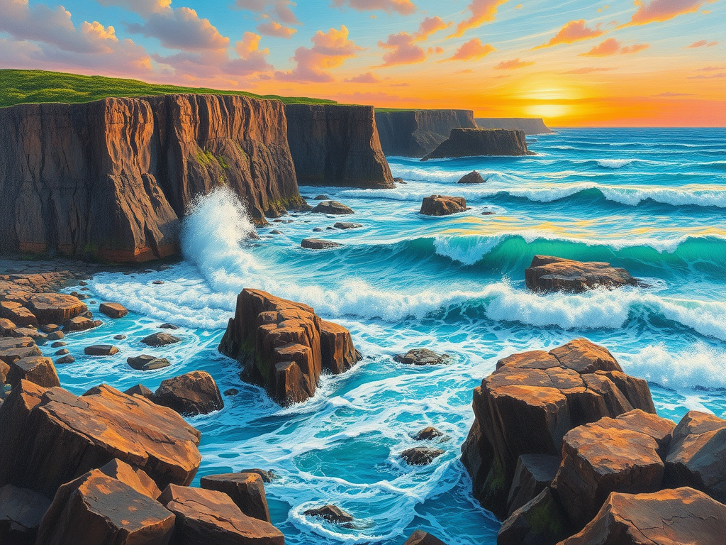 نقاشی از ساحل صخرهای با امواج خروشان.