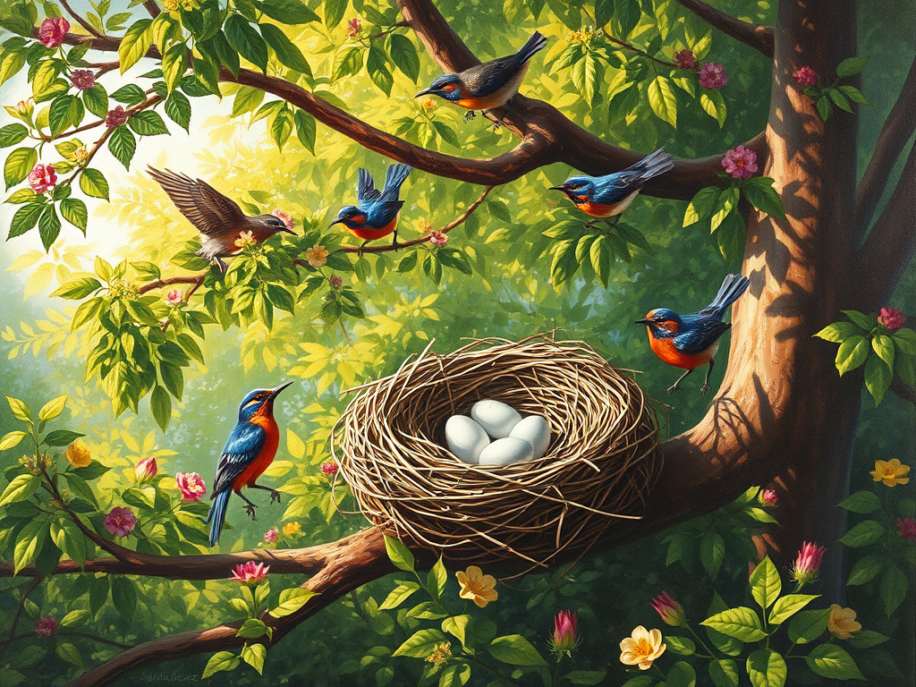 نقاشی از لانه پرندگان در میان درختان.