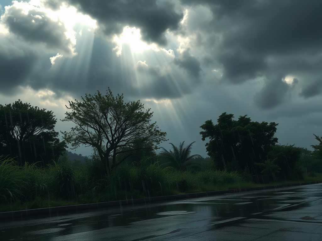 تصویری از یک روز ابری و بارانی با رنگهای تیره و روشن.