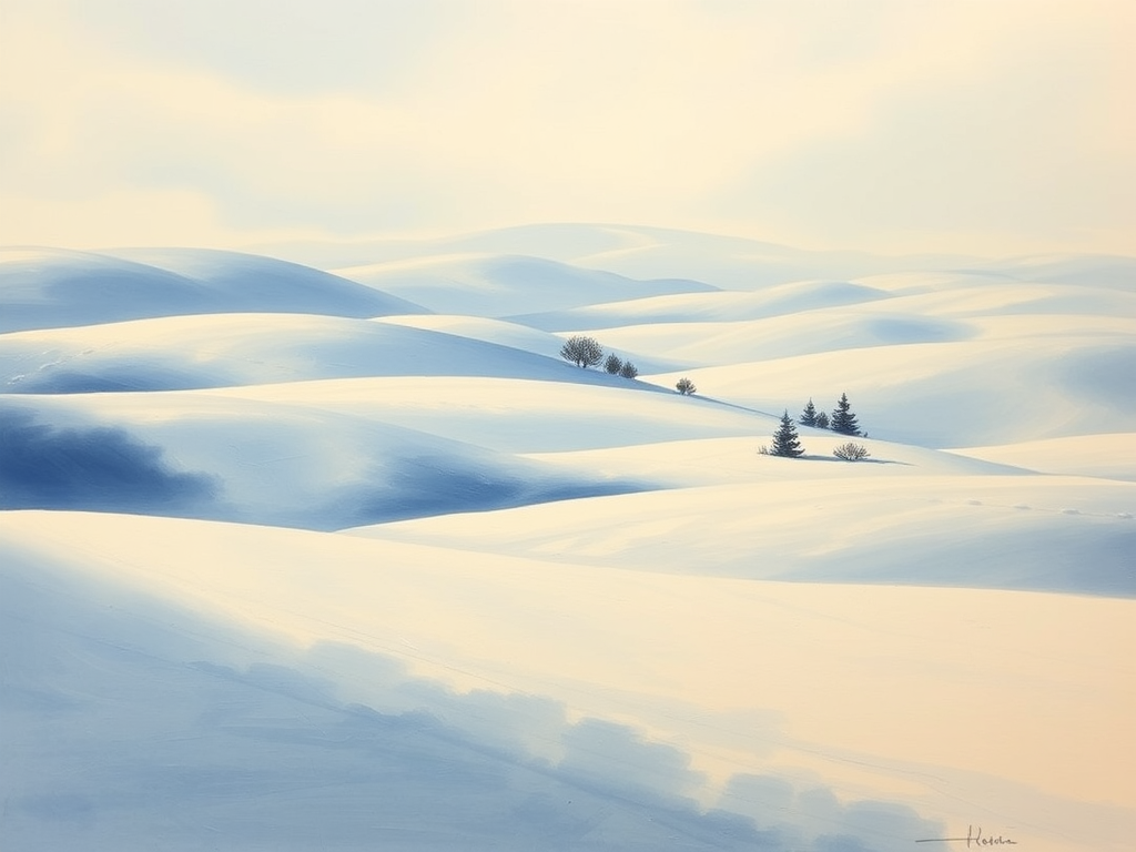نقاشی از دشتهای پوشیده از برف با سایههای آبی و خاکستری.