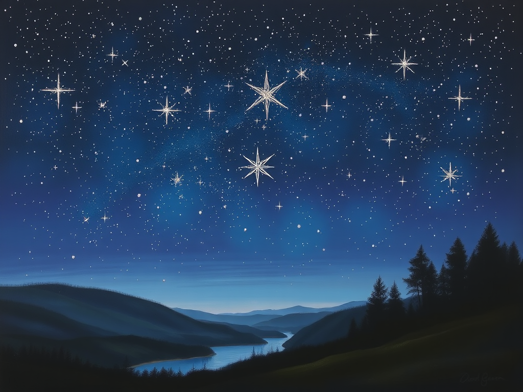 نقاشی از آسمانی پرستاره بالای یک منظره طبیعی.